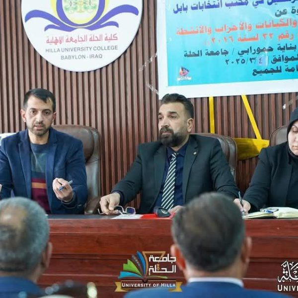 كلية القانون تنظم ندوة توعوية حول قانون حظر حزب البعث والكيانات الإرهابيةLawمارس 17, 2025برعاية السيد رئيس جامعة الحلة الاستاذ الدكتور(عقيل السعدي) المحترم، وبالتعاون مع شعبة شؤون الأحزاب والمرشحين في مكتب ... اقرأ أكثر